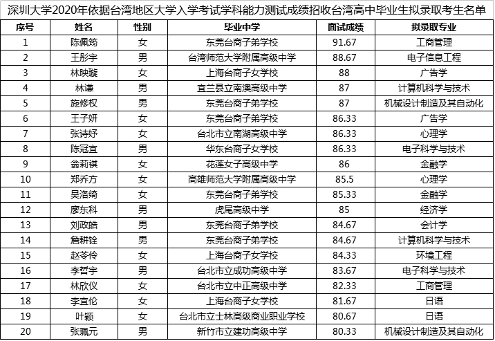 根据教育部有关文件精神及《深圳大学2020年依据台湾地区大学入学考试学科能力测试成绩招收台湾高中毕业生简章》,2020年有26名符合条件的台湾高中毕业生参加了我校的面试。经过评委面试、招生领导小组审批,根据申请人的面试情况、台湾地区入学考试学科能力测验成绩、提交材料情况和我校实际情况等因素综合考虑,确定面试成绩合格线为80分,拟择优录取20名台湾高中毕业生。现将拟录取名单和拟录取专业予以公示。