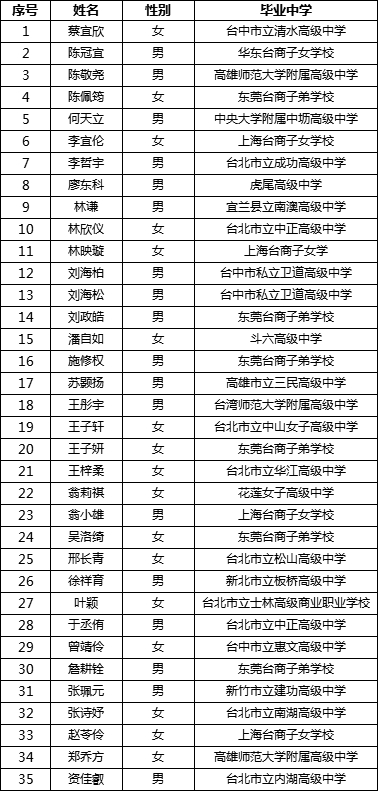 根据教育部有关文件精神及《深圳大学2020年依据台湾地区大学入学考试学科能力测试成绩招收台湾高中毕业生简章》的要求,我校对报名考生的资格进行了初审。现将初审合格名单公示如下:
