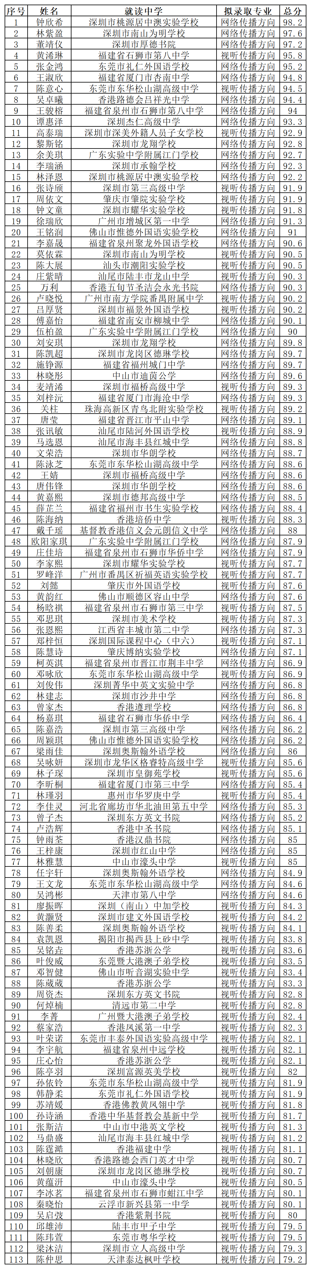 根据教育部相关文件及《深圳大学香港学院2024年自主招收香港学生简章》,经过专家组初审、评委考核、招生领导小组审批,拟择优录取113名学生(拟录取线为79.2分),现将拟录取名单予以公示。